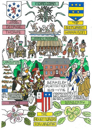 1710: Benjamin dies leaving Berkeley to his son, also named Benjamin, who is shown here as one of the signatories to the Declaration of Independence. Three times Governor of Virginia his other claim to fame was to be as the father of a son and have a grandson both of whom would become Presidents of the United States.